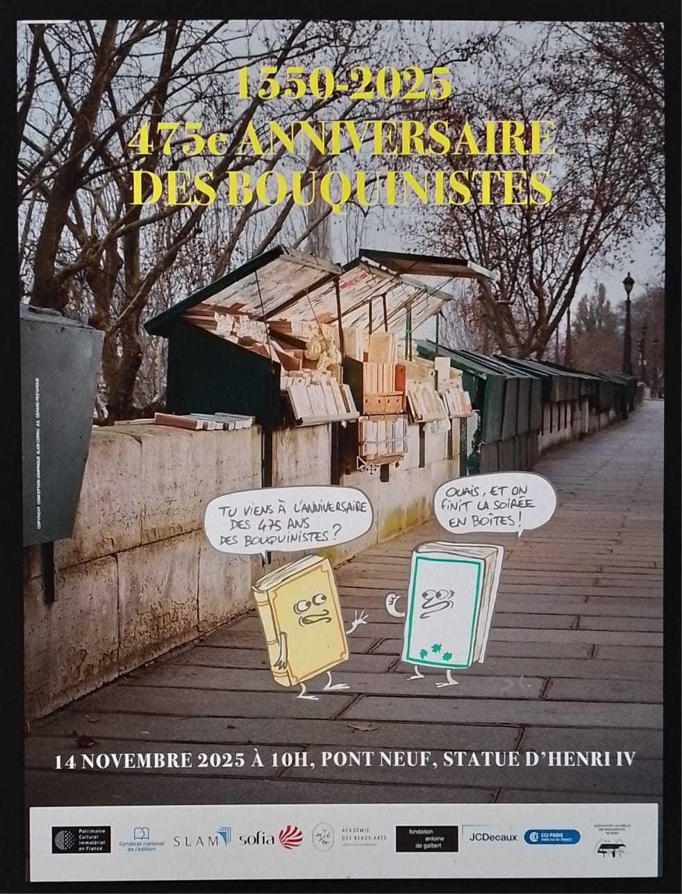 Lo scorso venerdi 14 novembre 2025 si sono tenute a Parigi le celebrazioni per il 475° anniversario della presenza ininterrotta dei “bouquinistes” della Senna, i celebri librai che dal 1550 presidiano le rive del fiume parigino, costituendo quello che è probabilmente il più conosciuto mercato “en plein air” del mondo.